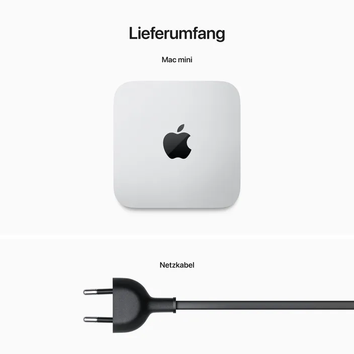 Mac miniNetzteilNetzspannung: 100 bis 240 V WechselstromFrequenz: 50 Hz bis 60 Hz, einphasigandere Konfigurationen findest du in unserem Mac-Konfigurator oder auf Anfrage