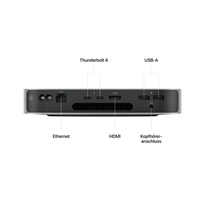 Rückansicht des Mac mini, die die zwei Thunderbolt 4 Anschlüsse, den HDMI Anschluss, zwei USB‑A Anschlüsse, den Kopfhöreranschluss, den Gigabit Ethernet Anschluss, den Netzeingang und den Ein‑/Ausschalter zeigt.