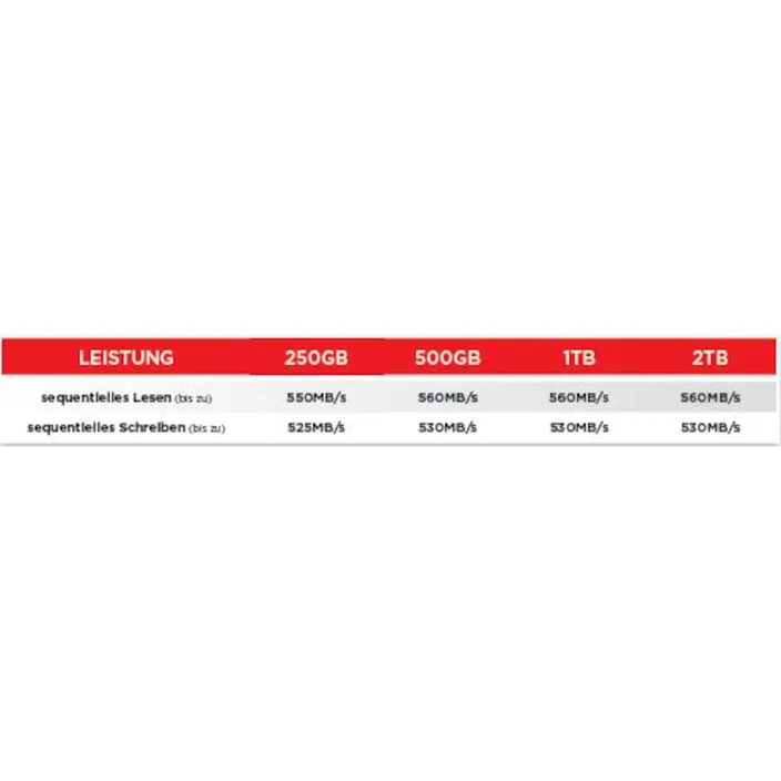 Maximale Lesegeschwindigkeit: 560 MB/sMaximale Schreibgeschwindigkeit: 530 MB/s