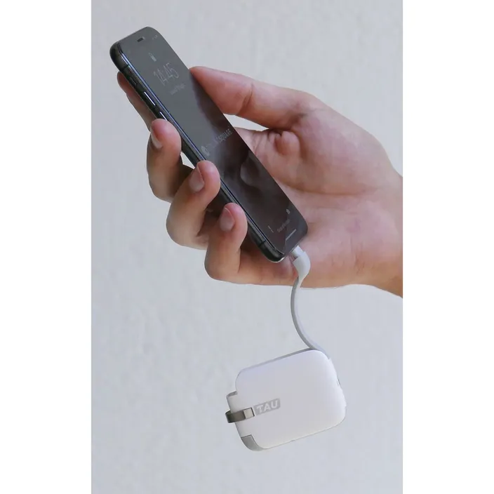 Die Powerbank TAU ist eine kleine 3-in-1 Powerbank und dadurch eine bequeme Alternative zu anderen, schweren Ladegeräten. Dank der zwei integrierten Kabel ist sie mit jedem