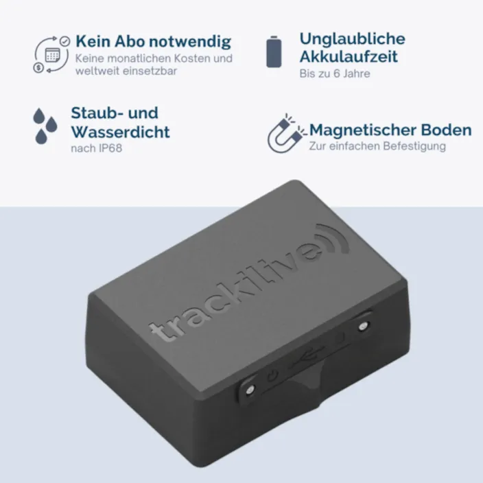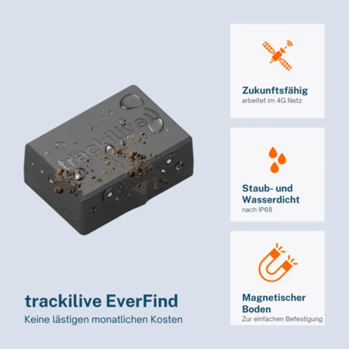 Du brauchst einen GPS Tracker, der keine monatlichen Kosten verursacht? Dann ist der neue trackilive EverFind GPS Tracker genau das Richtige für Dich! Mit seiner robusten Bauweise und modernster Technologie sorgt er dafür, dass Du jederzeit den Überblick behältst. Die sparsame LTE-M Technik garantiert Batterielaufzeiten von bis zu 6 Jahren und mit der IP68 Zertifizierung ist der GPS Tracker sogar staub- und wasserdicht.