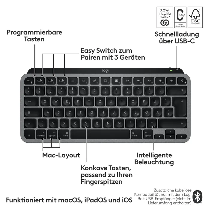 Die Kunststoffteile von MX Keys Mini for Mac bestehen teilweise aus zertifiziertem recyceltem Kunststoff (Hellgrau: 12 % (5)); CO2-Bilanz des Produkts: 9,96 kg CO2e; zertifiziert CO2-neutral.
