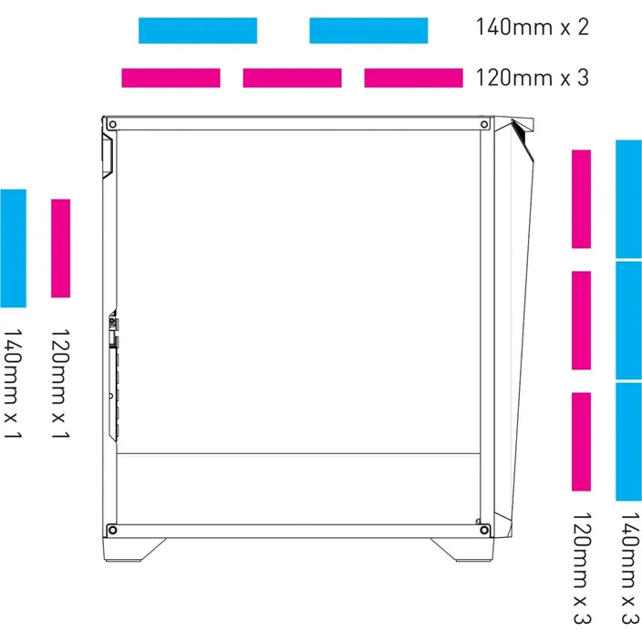 Vorn: 3x 120mm (RGB beleuchtet) oder 3x 140mm (optional)Oben: 3x 120mm (optional) oder 2x 140mm (optional)Hinten: 1x 120mm (RGB beleuchtet) oder 1x 140mm (optional)Vorinstalliert3x 120mm (RGB beleuchtet) vorn1x 120mm (RGB beleuchtet) hintenWasserkühlung:Radiatoren120/​140/​240/​280/​360mm vorne120/​140/​240/​280/​360mm oben120/​140mm hinten