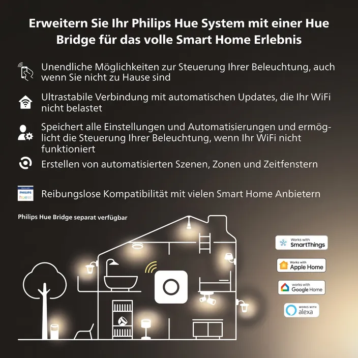 Erlebe das gesamte Spektrum der Philips Hue Funktionen mit einer Hue Bridge noch intensiver: Mit einer Hue Bridge kannst Du bis zu 50 smarte Philips Lampen in Deinem ganzen Zuhause verwenden. Erstelle Timer und Routinen, um Dein gesamtes Smart Home Lichtsystem automatisch zu steuern und verwende Deine Lampen, um natürlich aufzuwachen oder schlafen zu gehen. Steuere Deine Lampen, auch wenn Du nicht zuhause bist oder füge Zubehör wie Bewegungssensoren und smarte Schalter hinzu.