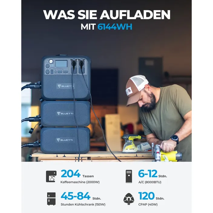 B230 hat über 3.500 Lebenszyklen mit erstklassigen LFP-Zellen und bietet bis zu 80 % der ursprünglichen Kapazität. Darüber hinaus ist sie zusätzlich mit BLUETTI AC200MAX kompatibel, um die Kapazität zu erhöhen.