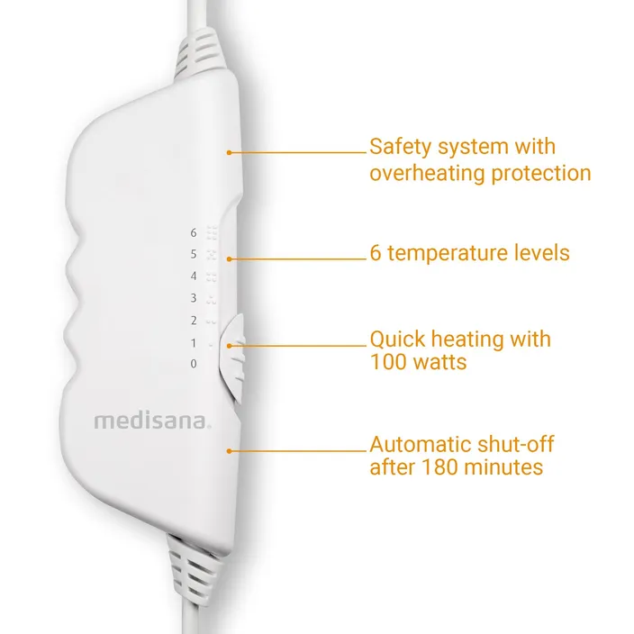 - AusstattungÜberhitzungsschutzwaschbarZwei Wärmezonen für Körper und Füße6 TemperaturstufenAutomatische Abschaltung nach drei Stunden