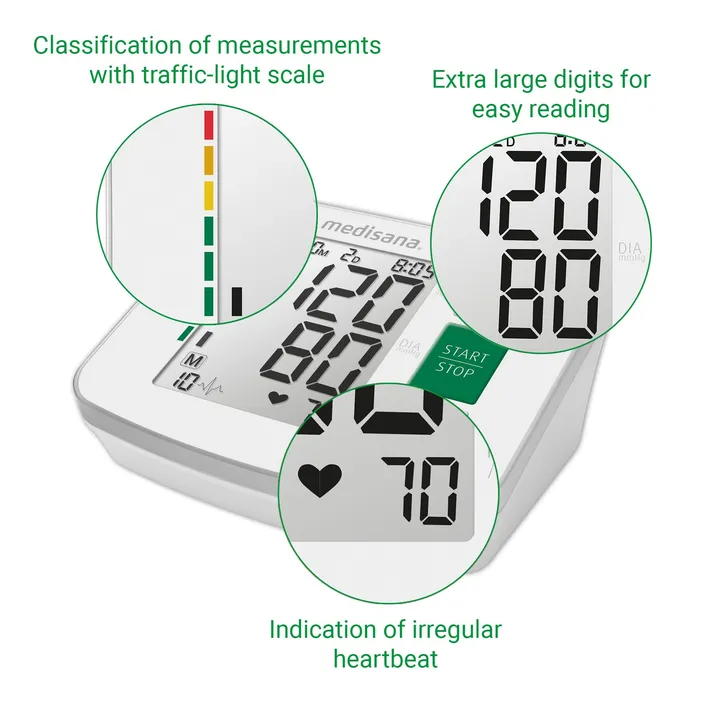 - Displayanzeige: Systole, Diastole, Puls, Datum, Uhrzeit