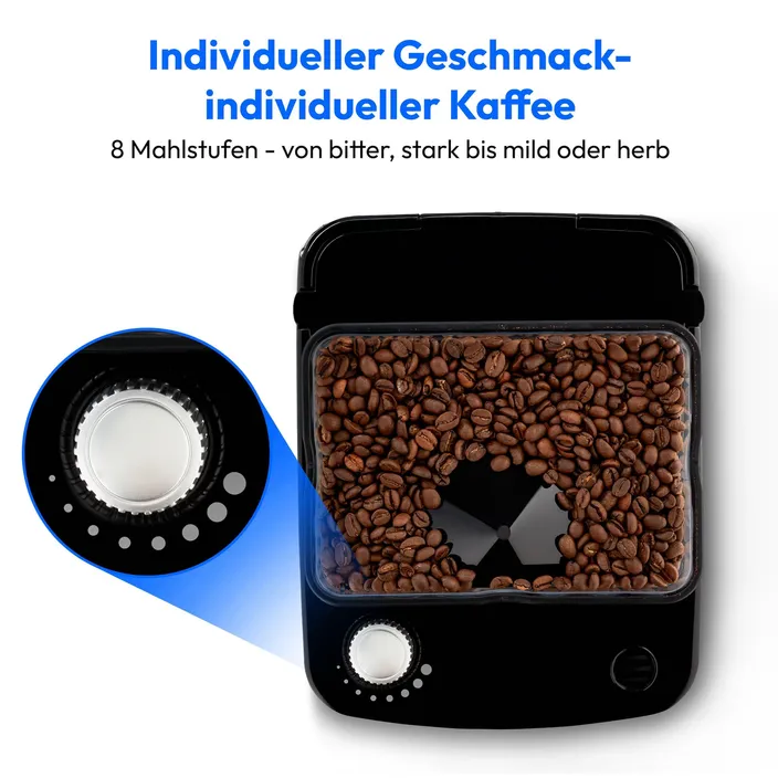 - Auswahl der gemahlenen Kaffeemenge 2,4,6,8
