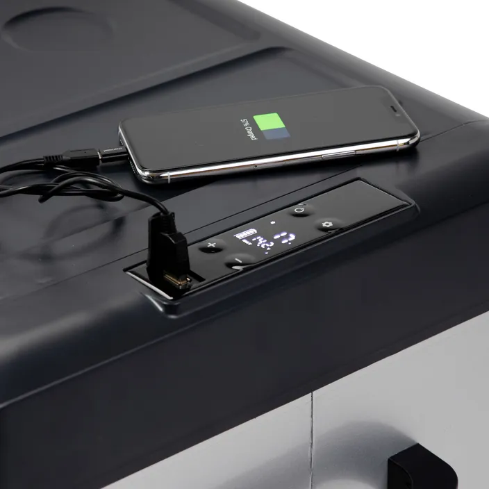 Verstärkte Kanten runden ein robustes und für jeden Einsatz taugliches Design perfekt ab. Die Griffe können jederzeit abmontiert werden und der Deckel lässt sich längsseitig und stirnseitig montieren (Dual-Opening). Auf dem eingebauten LC-Display sind alle wichtigen Informationen abzulesen, wie z.B. die Temperatur, der Batteriestatus oder die Batteriespannung. Die eingebaute LED-Lampe sorgt auch nachts für eine klare Sicht. Mit Hilfe des eingebauten USB-Ports können während des Kühlvorgangs weitere Geräte aufgeladen werden.