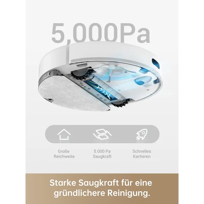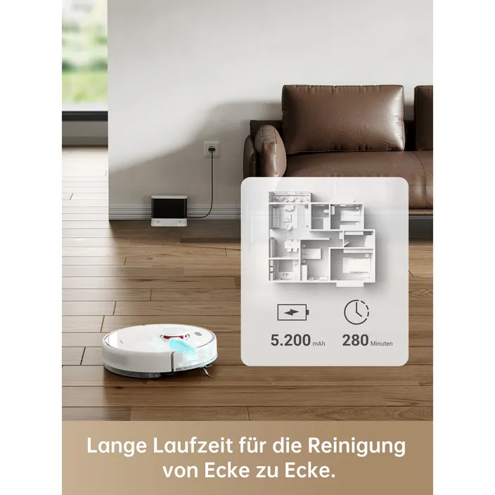 Genießen Sie eine umfassende Reinigung von Ecke zu Ecke dank des 5.200mAh-Akkus, der bis zu 280 Minuten kontinuierliche Reinigung liefert. Bei niedrigem Strom kehrt der Roboter automatisch zum Aufladen zurück.