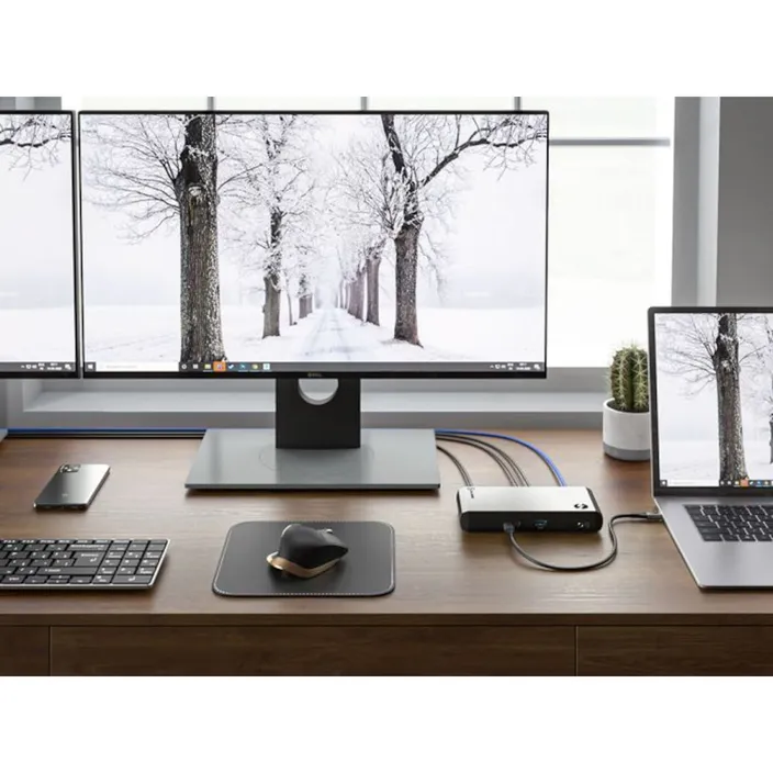Das Dock bietet universelle Kompatibilität zwischen Mac und Windows für die Unterstützung von zwei Monitoren auf allen Laptops mit Thunderbolt 3- oder USB-C-Anschlüssen. Dadurch können IT-Experten das TURBO-Dock als einzige Dock-Lösung für alle Benutzer bereitstellen und so Hot-Desk-Setups an Arbeitsplätzen mit plattformübergreifenden Laptops ermöglichen, die entweder über Thunderbolt 3- oder USB-C-Ausgänge verfügen.