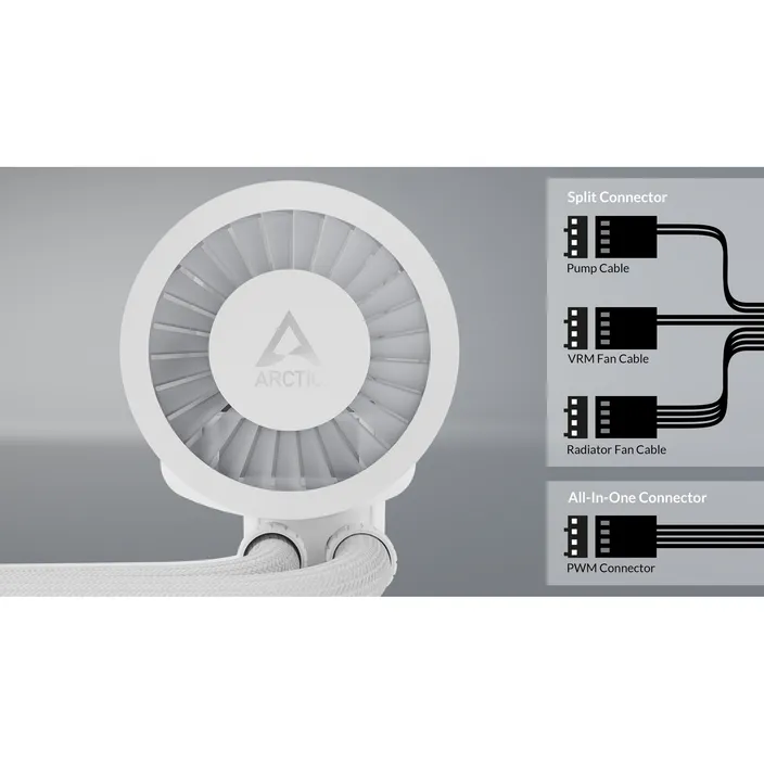 All-in-One: Wie beim Liquid Freezer II ermöglicht dies die Steuerung der gesamten Einheit über einen einzigen Anschluss, wobei die Drehzahl der Radiatorlüfter ausgegeben wird. Pumpe, VRM- und Radiatorlüfter können somit einfach über eine einzige PWM-Einstellung geregelt werden.