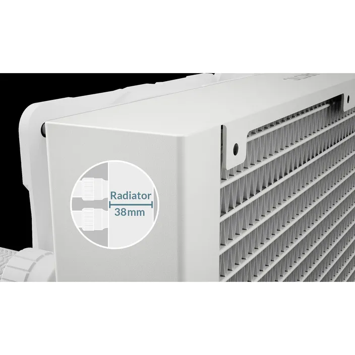 Die Kühloberfläche des 38 mm dicken Radiators konnte durch eine Erhöhung des Fin-Stacks um 23 % erweitert werden. Dies ermöglicht nicht nur eine verbesserte Wärmeabfuhr, sondern auch ein größeres Flüssigkeitsvolumen. Dadurch wird die Wärmesättigung der Wasserkühlung verlangsamt, und Leistungs- sowie Temperaturspitzen können über einen längeren Zeitraum effektiv bewältigt werden.