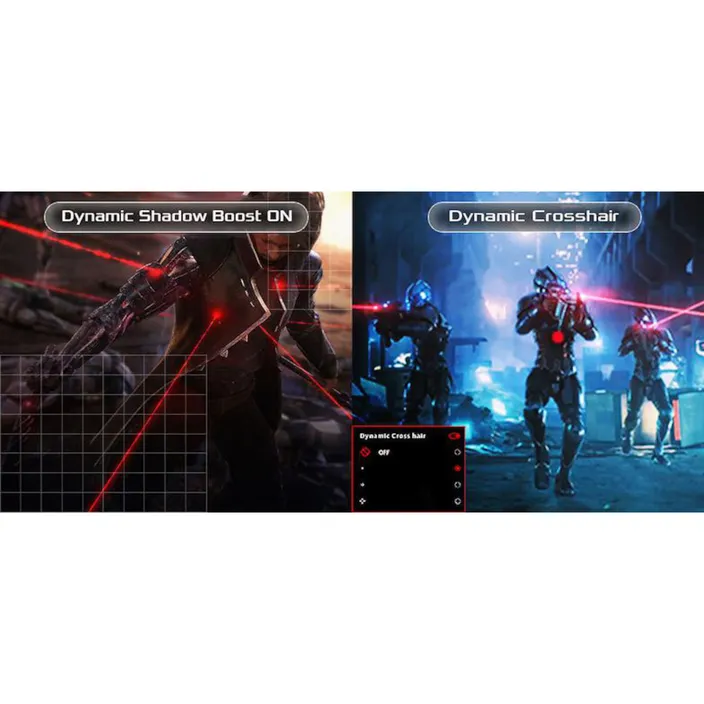 - Die ROG Gaming Artificial Intelligence Technologie mit Dynamic Shadow Boost, variablem OD und dynamischem Fadenkreuz verbessert das Spielerlebnis.