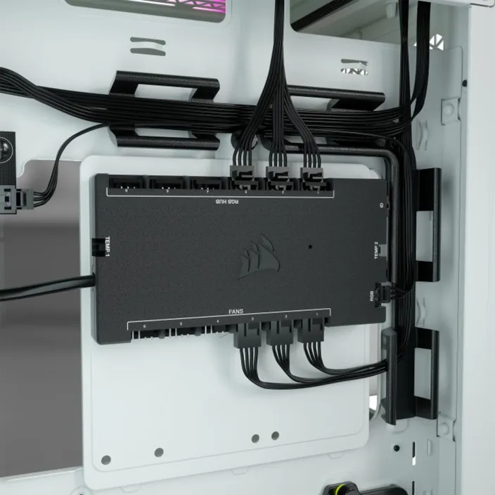 Ein intelligenter Controller zur Steuerung von Lüfterdrehzahlen für bis zu sechs PWM-Lüfter und von zwei Beleuchtungskanälen für mehrere RGB-Komponenten.