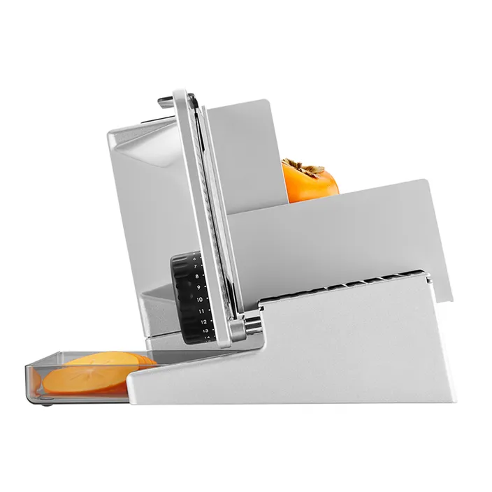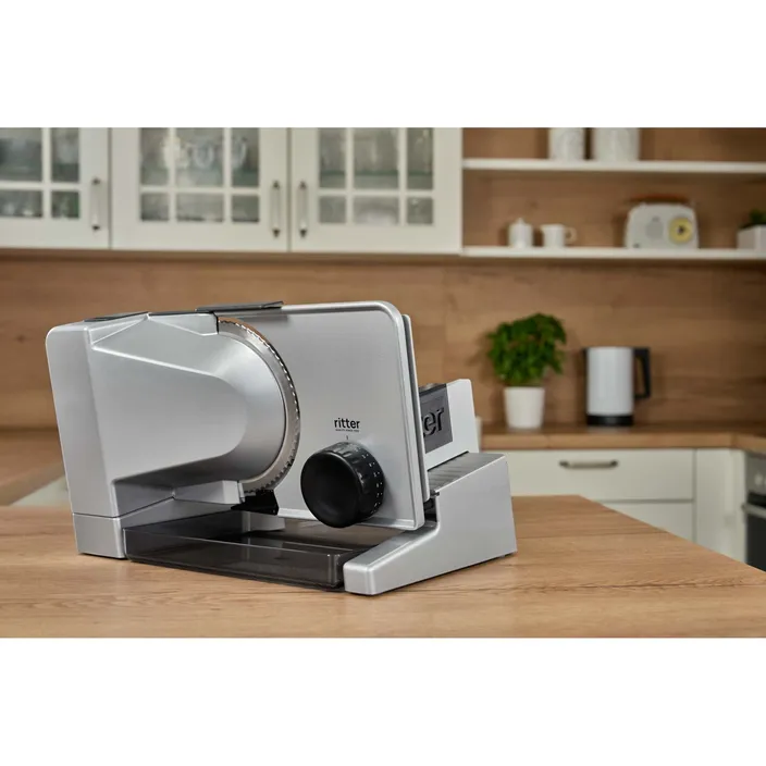 Die Schnittstärke ist von hauchdünn bis ca. 23 mm präzise einstellbar. Durch die stufenlose Schnittstärkeeinstellung lässt sich das Schneidgut in appetitliche Scheiben schneiden.