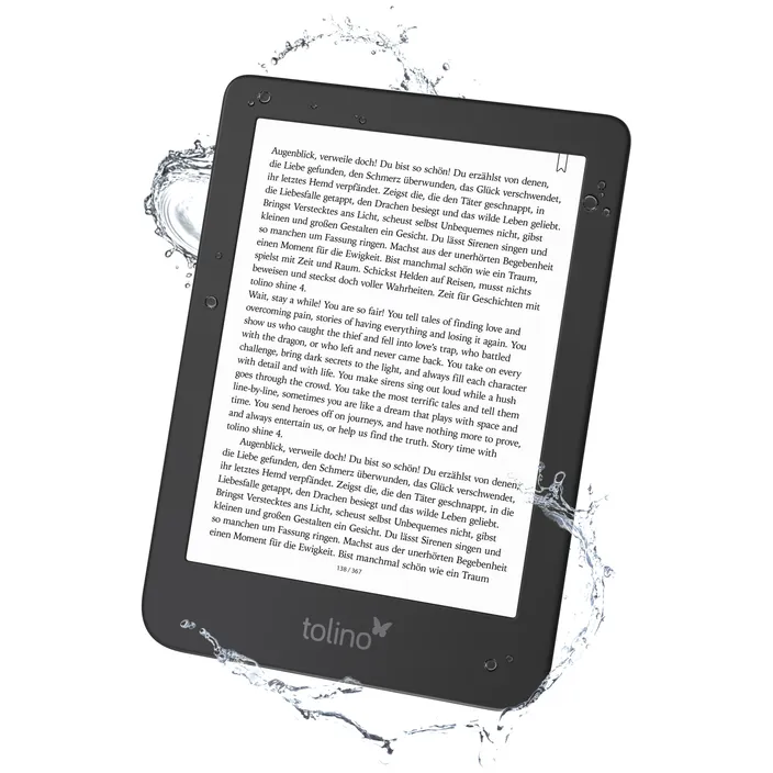 Genießen Sie eine entspannte Leseauszeit mit Ihrem Lieblingsbuch – egal ob in der Badewanne, im Pool oder am See. Denn das Gerät ist von innen heraus gegen Wasser geschützt und verzeiht so selbst ein kurzes Eintauchen ins Nass. Sollte Ihnen der eReader also versehentlich einmal aus der Hand gleiten, bleiben Sie ganz ruhig: Dem tolino shine 4 wird es nichts anhaben.