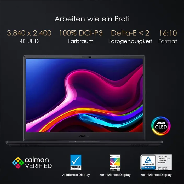 Das gestochen scharfe 4K-OLED-Display gibt Farben lebensecht wieder, liefert satte Kontraste und bietet extrem schnelle Reaktionszeiten. Bei bis zu 400 Nits Helligkeit sind selbst unter schwierigen Lichtbedingungen optimale Ergebnisse möglich und die Augen werden dank reduziertem Blaulicht geschont. Das bestätigt auch der TÜV Rheinland. Dazu ist das großzügige 16:10-Display nach HDR™ 500 True Black und PANTONE®-validiert, bietet tiefe Schwarztöne und bildet 100 Prozent des DCI-P3-Farbraums ab.