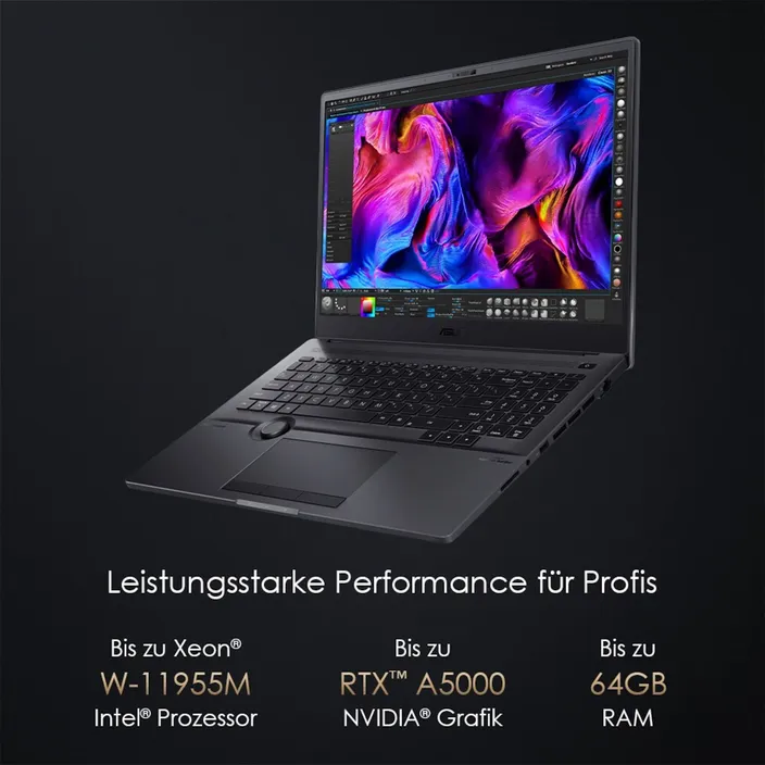 Für einen anspruchsvollen Workflow muss die Performance stimmen und hier liefert das ProArt Studiobook Pro 16 OLED eine beeindruckende Leistung: Mit seinem bis zu Intel® Xeon® WM 11995M High-End-Prozessor gepaart mit bis zu NVIDIA® RTX™ A5000 und bis zu 2x2 TB PCIe® SSD-Speicher mit RAID-Technologie für einen schnelleren Betrieb sowie bis zu 64 GB High-Speed-RAM bringt das Notebook die nötigen Voraussetzungen mit, um Ideen an jedem Ort uneingeschränkt und ohne Qualitätsverluste umsetzen zu können. Ein smartes und leises Kühlungssystem sorgt dafür, dass auch ausdauernde Sessions dabei nicht zum Problem werden.