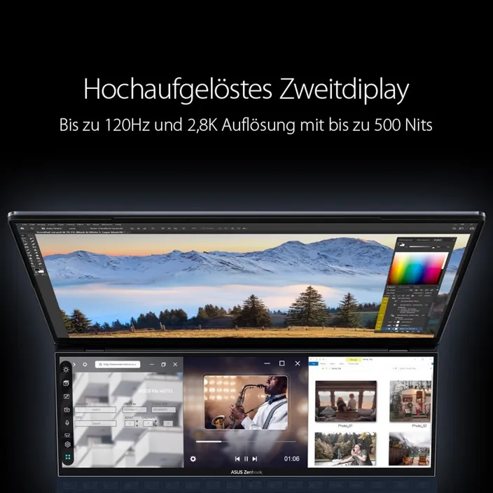 • ScreenPad Plus: das bis zu 120 Hz 2,8K Zweitdisplay (12,7″) mit bis zu 500 Nits für eine XXL Arbeitsfläche