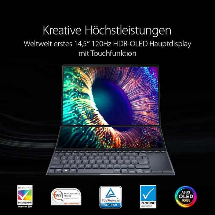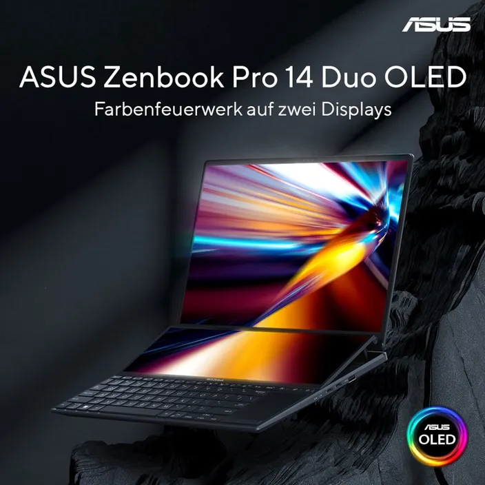 Zwei gestochen scharfe und ultraschnelle Bildschirme in einem Premium-Notebook! Mit dem ASUS Zenbook Pro 14 Duo OLED erwachen Bilder zum Leben. Das HDR OLED Hauptdisplay wird fast nahtlos mit dem ScreenPad Plus ergänzt. Beide Displays arbeiten mit 120Hz und 500 Nits Helligkeit. High Performance gewährleisten auch der bis zu Intel® Core™ i9 Prozessor der 13. Generation, die spektakuläre Grafik der NVIDIA® GeForce RTX™ 4060 GPU und enorme Speicherplatzkapazität von bis zu 2 TB, während das smarte und leise AAS Ultra-Kühlungssystem lange Sessions möglich macht – für grenzenloses Surfen, Streamen und Arbeiten.
