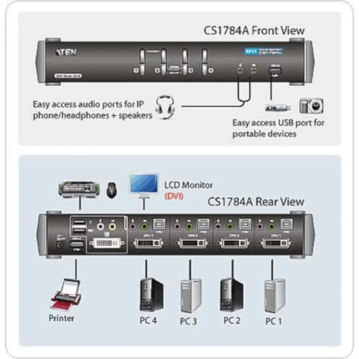 Der CS1784A USB DVI Dual Link KVM Switch in eine revolutionäre Richtung in Sachen KVM-Switch-Funktionalität. Der Switch vereint die Funktionen eines 4-Port KVM-Switch mit einem 2-Port USB-Hub und bietet gleichzeitig eine DVI-Monitor-Schnittstelle und Audio-Unterstützung. Außerdem kann ein 120Hz 3D-Display angeschlossen werden, es werden Gamer-Tastaturen unterstützt und eine Umschaltung per Maus ist nun auch möglich.