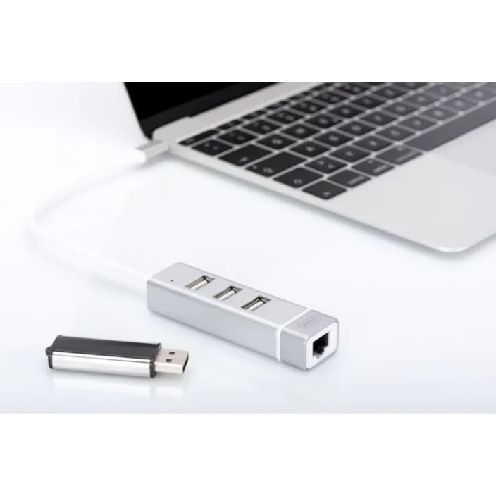 Erweitern Sie Ihren Typ C Laptop mit 3 USB Ports und einem Fast Ethernet Anschluss.