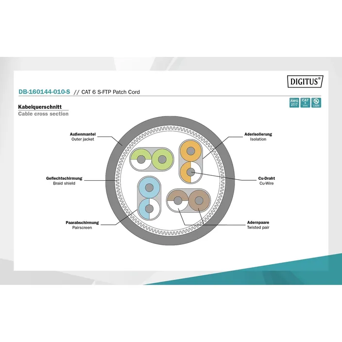 - Kabeltyp: S/FTP; Kategorie: 6A (IEC)