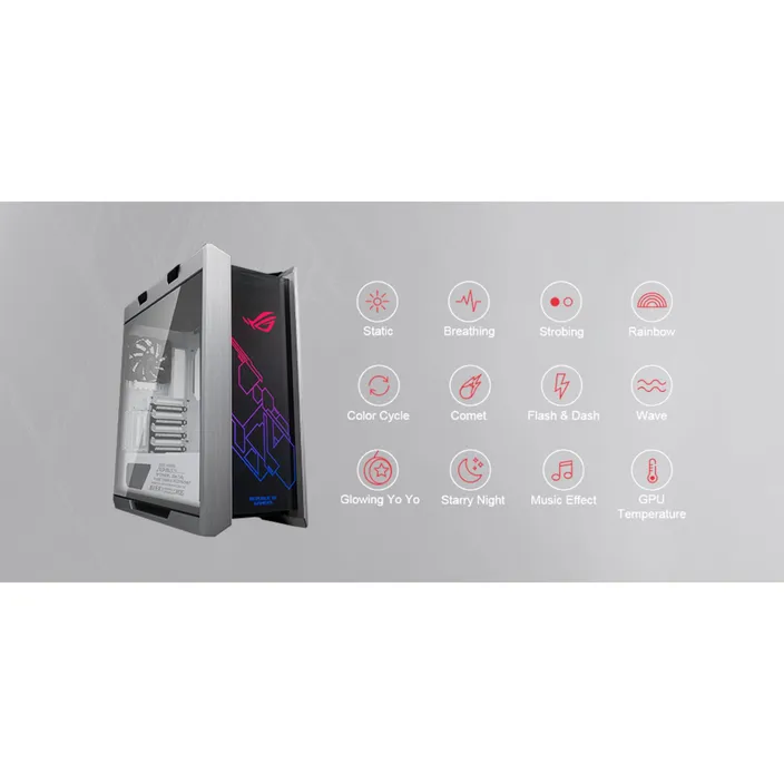 Mit integrierten, adressierbaren RGB-LEDs in der Frontplatte, die über eine spezielle Steuertaste oder mit der AURA-Software konfiguriert werden können, kann das ROG Strix Helios Millionen von Farben und ein breites Spektrum von Effekten wiedergeben. Die Beleuchtung kann zusätzlich mit einem riesigen Ökosystem von Komponenten synchronisiert werden, um dein System noch individueller zu gestalten.