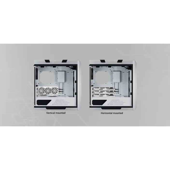 Eine Multifunktionsabdeckung mit GPU-Halterungen versteckt auf clevere Weise die Verkabelung, bietet stabilen Halt für Grafikkarten und ermöglicht die Montage einer SSD-oder eines ROG-AURA-Terminals zu Demonstrationszwecken. Ihre Position kann angepasst werden, um entweder ein ATX- oder ein EATX-Mainboard aufzunehmen.
