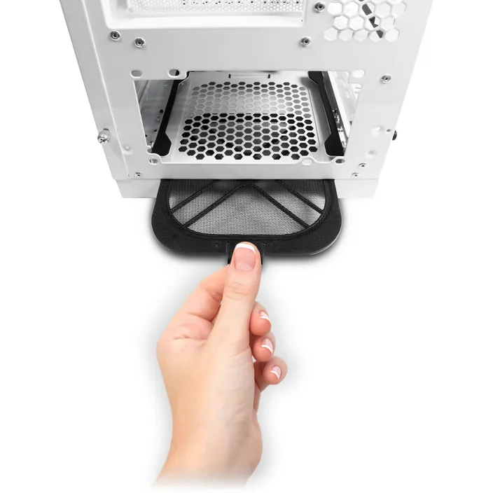 Im Deckel des Gehäuses befindet sich ein großflächiger Staubfilter, der den Innenraum des Gehäuses vor Staub schützt. Durch zwei einfache Klicks wird der Staubfilter entnommen und kann so auf einfache und schnelle Weise gereinigt werden.