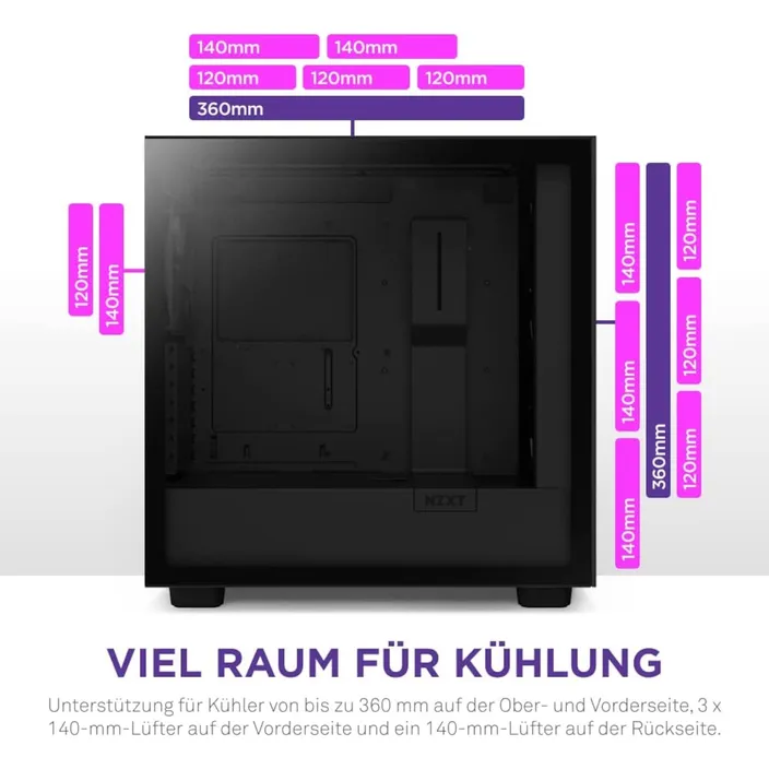 Unterstützung für RadiatorVorderseite: bis zu 360 mmOberseite: bis zu 360 mmRückseite: bis zu 140 mmKühlsystem ( 3x RGB 140mm Lüfter verbaut)Vorderseite: 3x 120 / 3x 140 mmOberseite: 3x 120 mm / 2x 140 mmRückseite: 1x 120 mm / 1x 140 mm
