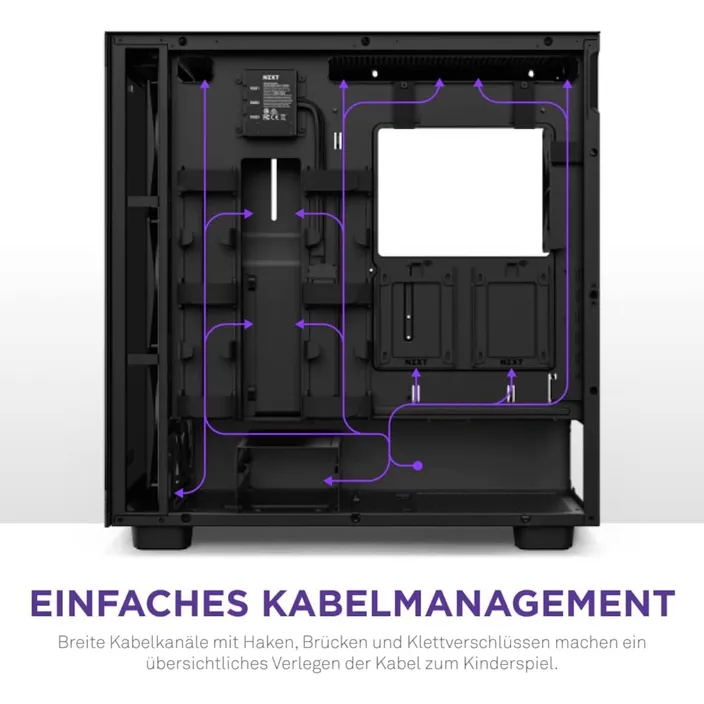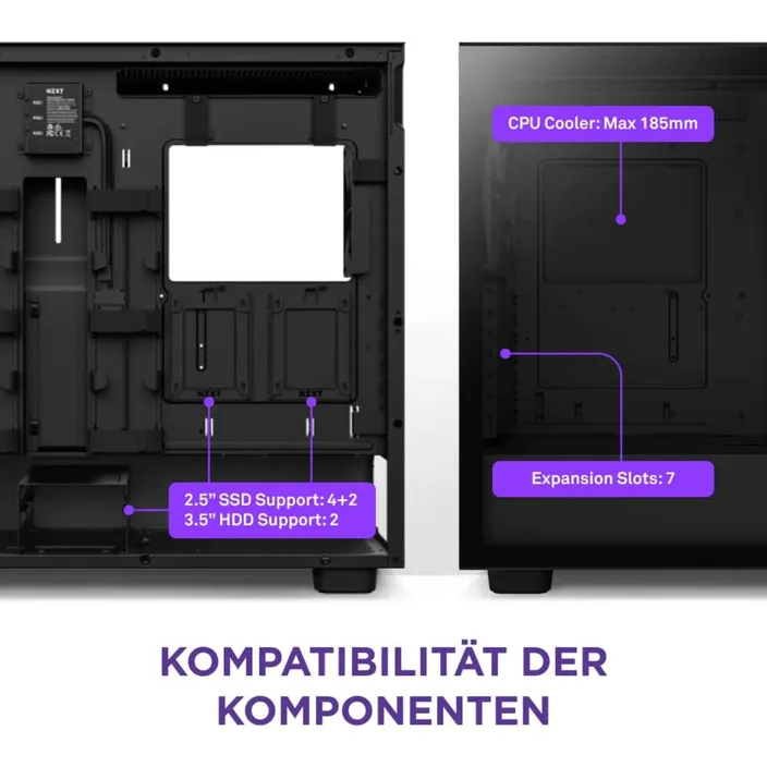 NZXT RGB Connector:6 (Support up to 120 LEDs)Maximale Grafikkartenlänge: 400mmMaximale CPU Kühlerhöhe: 185 mmFront Radiator Clearance: 60mmTop Radiator Clearance: 30mmKabelmanagement: 18-22mm