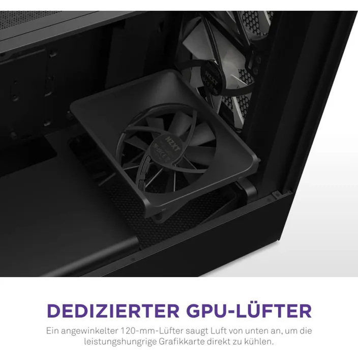 Ein angewinkelter 120-mm-Lüfter saugt Luft von unten an, um die leistungshungrige Grafikkarte direkt zu kühlen.