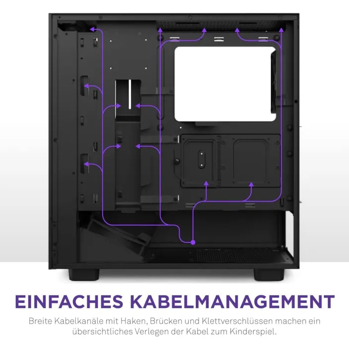 - Kabelführungsset mit vorinstallierten Kanälen und Schlaufen.
