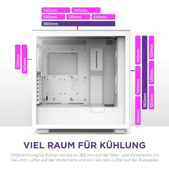Vorder- und Oberseite unterstützen Radiatoren bis zu 360 mm