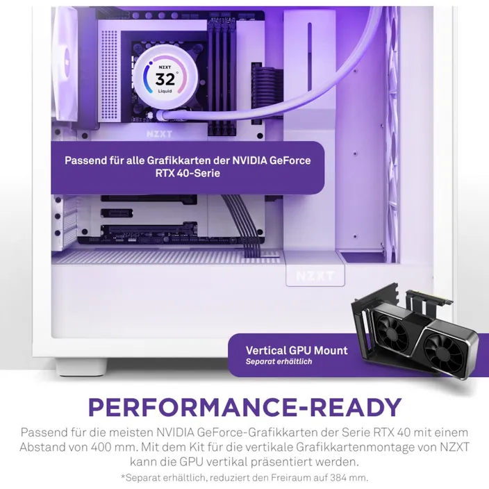 Passend für die meisten NVIDIA GeForce-Grafikkarten der Serie RTX 40 mit einem Abstand von 365 mm. Mit dem Kit für die vertikale Grafikkartenmontage von NZXT kann die GPU vertikal präsentiert werden.*
