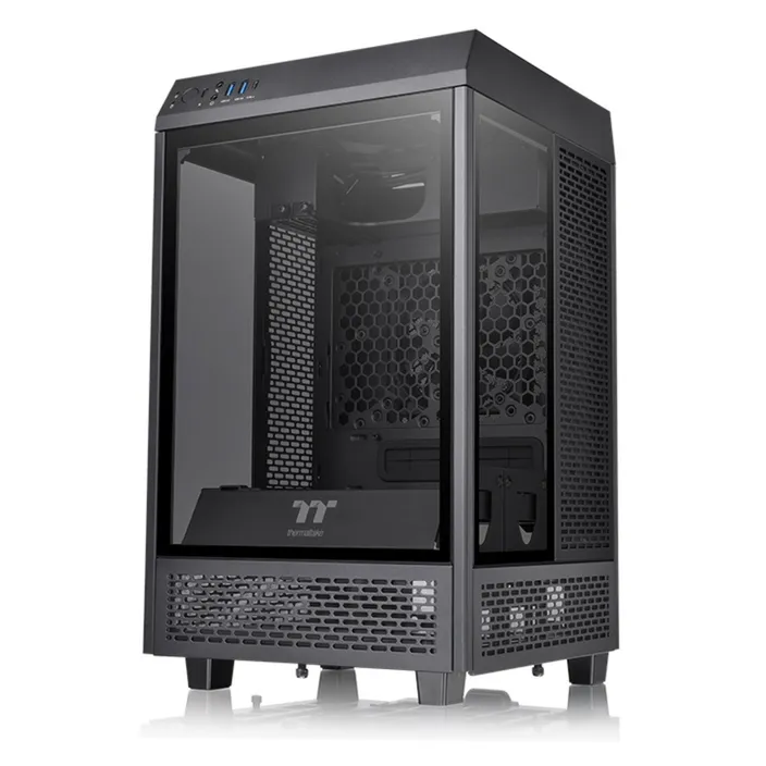 Der Tower 100 ist ein vertikal gestaltetes Mini-ITX-Gehäuse mit Panoramablick. Es wird mit zwei vorinstallierten 120 mm Standardlüftern und drei gehärteten 4 mm Glasfenstern an der Vorderseite, auf der linken und rechten Seite geliefert.