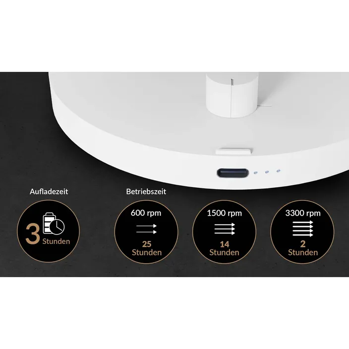 Im normalen Betrieb mit etwa 1500 Umdrehungen beträgt die Laufzeit 14 Stunden, bei vollen 3300 Umdrehungen 2 Stunden. Innerhalb von 3 Stunden kannst du den Summair Plus mithilfe des mitgelieferten 1,2 Meter langen USB-C auf USB-A Ladekabels aufladen und bei geringster Geschwindigkeit bis zu 25 Stunden betreiben. Während des Ladens kann er ebenfalls per USB-Kabel betrieben werden.