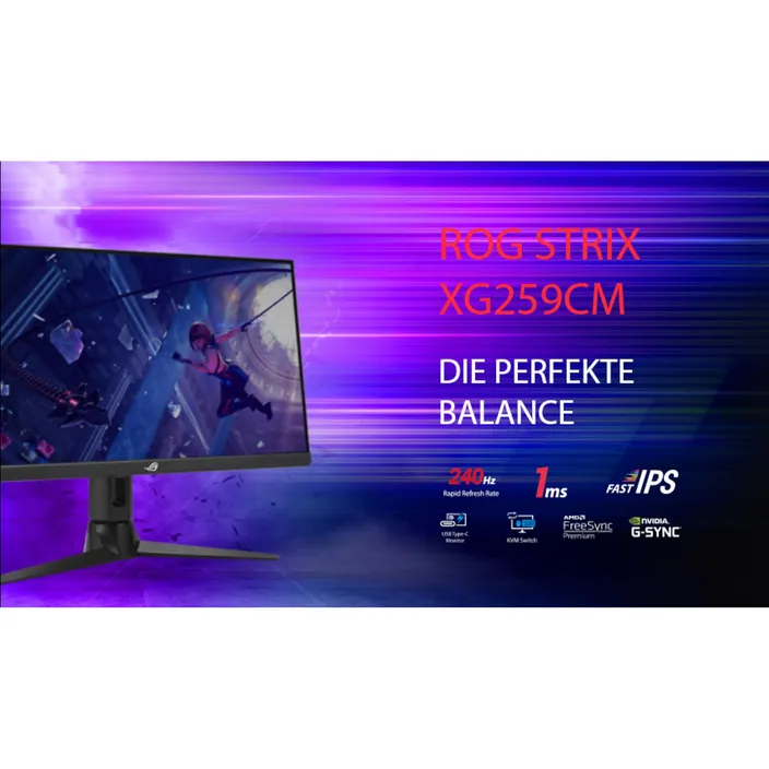 ROG Strix XG259CM Gaming Monitor - 24,5 Zoll 1920 x 1080, 240Hz (über 144Hz), 1 ms (GTG), Fast IPS, Extreme Low Motion Blur Sync, USB-Typ-C, 120% sRGB, G-Sync Compatible, KVM-Unterstützung, Stativanschluss