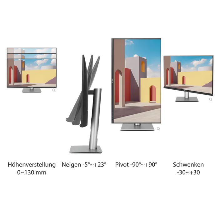 - ErgonomieNeigbarSchwenkbarHöhenverstellbar: 130mmPivotWandmontage: VESA100x100