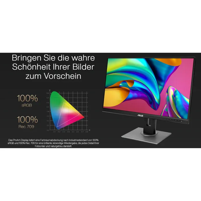 Das ProArt-Display liefert den Industriestandard 95 % DCI-P3 und 100 % sRGB/Rec. 709-Farbraum für eine satte, lebendige Wiedergabe, die dafür sorgt, dass jedes Detail Ihrer Fotos klar und naturgetreu dargestellt wird.
