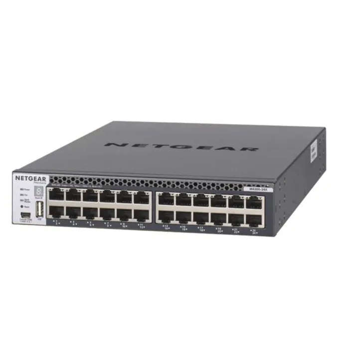 M4300-24X24F Stackable Managed Switch 24-port 10GBASE-T (RJ45) all independent, 24-port 10GBASE-X (SFP+) all independent, 960Gbps non-blocking fabric across 48 ports, Out-of-band 1G Ethernet Management port, Mini-USB and RJ45 RS232 console ports and USB storage port, Full L3 feature set and non-stop forwarding (NSF) stacking, Full width form factor with one-unit rack mount kit, Ships with one modular APS250W PSU in first power supply slot, Ship with a blank cover in the second power supply slot, Low acoustics (35.8dB @25°C ).