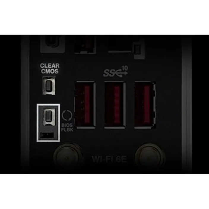 Die Taste Clr CMOS setzt die BIOS-Einstellungen schnell auf die Werkseinstellungen zurück. Sie kann auch verwendet werden, um den PC neu zu starten, wenn falsche BIOS-Einstellungen gewählt wurden.BIOS FLASHBACK™ BIOS FlashBack™ ist ein sicherer und einfacher Weg, das BIOS zu aktualisieren. Lege die (UEFI-)BIOS-Datei einfach auf einem FAT32-formatierten USB-Stick ab, stecke ihn in den USB-BIOS-FlashBack-Port und drücke den Knopf. Updates können sogar durchgeführt werden, ohne dass Speicher oder eine CPU installiert sind.