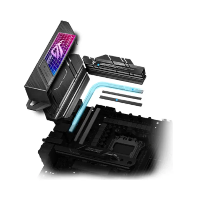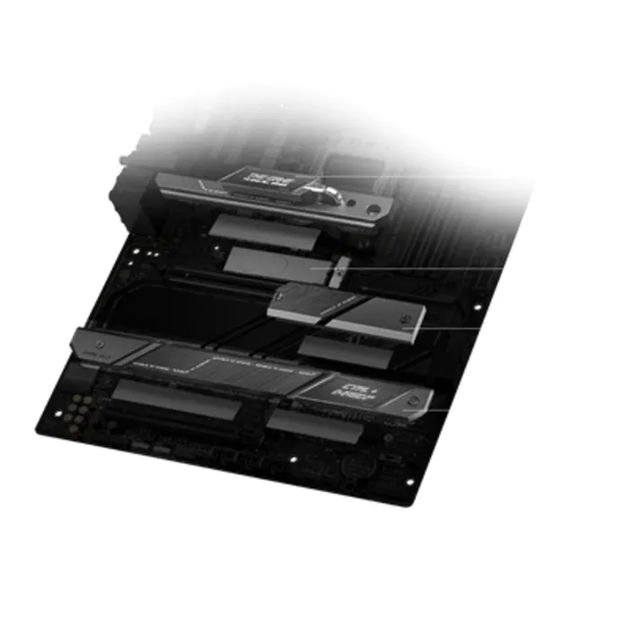 Optimiertes Kühlungsdesign: Massive VRM-Kühlkörper plus integrierte Aluminium-E/A-Abdeckung, hochleitfähiges Wärmeleitpad, L-förmige Heatpipe, M.2 Combo-Kühlkörper und M.2 Backplate für den PCIe® 5.0 M.2_1 Steckplatz, drei Onboard-M.2-Kühlkörper sowie ein massiver M.2-Kühlkörper als Zubehör