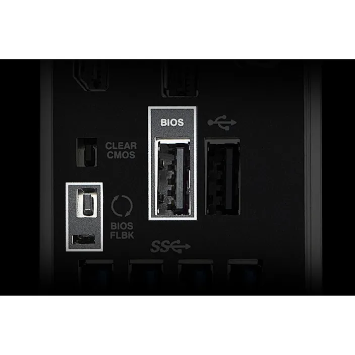 BIOS FlashBack™ ist ein sicherer und einfacher Weg, das BIOS zu aktualisieren. Lege die (UEFI-)BIOS-Datei einfach auf einem FAT32-formatierten USB-Stick ab, stecke ihn in den USB-BIOS-FlashBack-Port und drücke den Knopf. Updates können sogar durchgeführt werden, ohne dass Speicher oder eine CPU installiert sind.