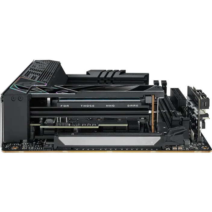 Lineare Belüftungsöffnungen und subtile gitterartige Texturen verleihen dem Strix Z790-I eine unauffällige Form, die sich in den Schatten der meisten SFF-Builds einfügt. Aber wenn ein wenig Licht auf die Seite des M.2-Gehäuses fällt, zeigen sich seine wahren Farben in Form eines prismatischen Scheins, der auf dem hochreflektierenden Aluminium glitzert, das das geprägte ROG-Logo umrandet.