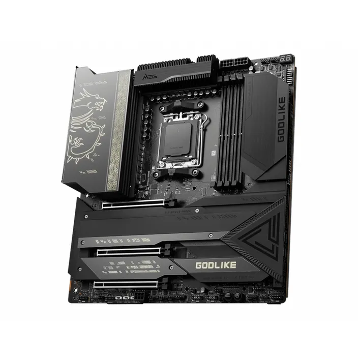 Das MEG X670E GODLIKE ist mit einem schwarzen und schweren Kühlkörper ausgestattet, der mit dunklem Spiegel- und Zeitschnitzdesign in hellgoldener Beleuchtung ausgestattet ist, das die zeitlose Form und Funktion symbolisiert und Perfektion in ihrer reinsten Form darstellt. Mit der neuesten Technologie, Hochgeschwindigkeitsübertragung, Ultraleistung und dem branchenweit ersten M-Vision-Dashboard wurde das MEG X670E GODLIKE entwickelt, um das extreme Gaming-Potenzial des AMD X670-Chipsatzes freizusetzen, und ist bereit, das Turnier erneut zu regieren.
