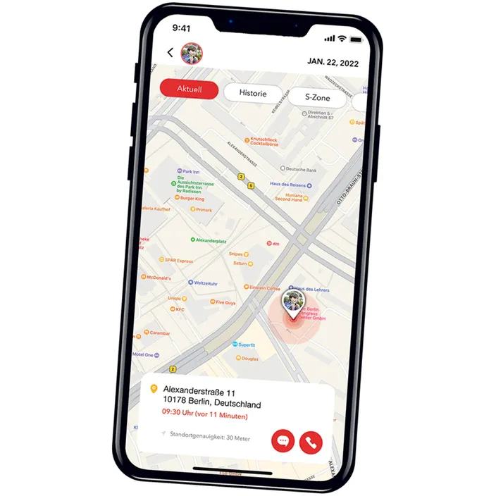 • GPS-Ortungsfunktion mit SOS-Funktion und Sicherheitszonen