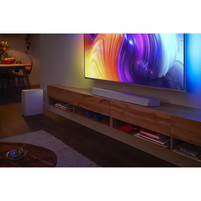 The One Soundbar mit kabellosem Subwoofer sorgt für ein echtes Kinoerlebnis. Spezielle Center-Kanal-Lautsprecher ermöglichen eine kristallklare Stimmwiedergabe und Dolby Atmos sorgt für unglaublich beeindruckenden Surround Sound.